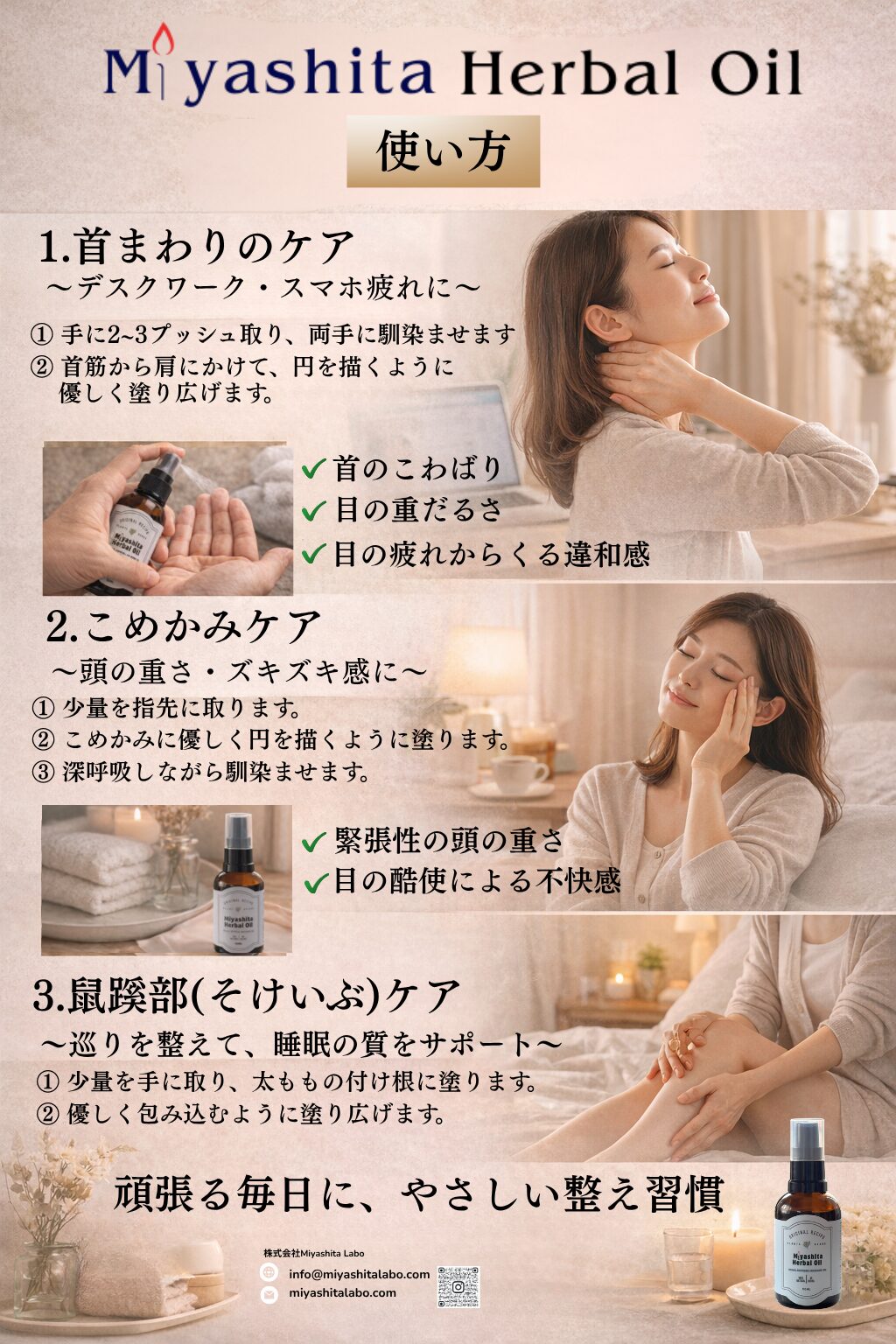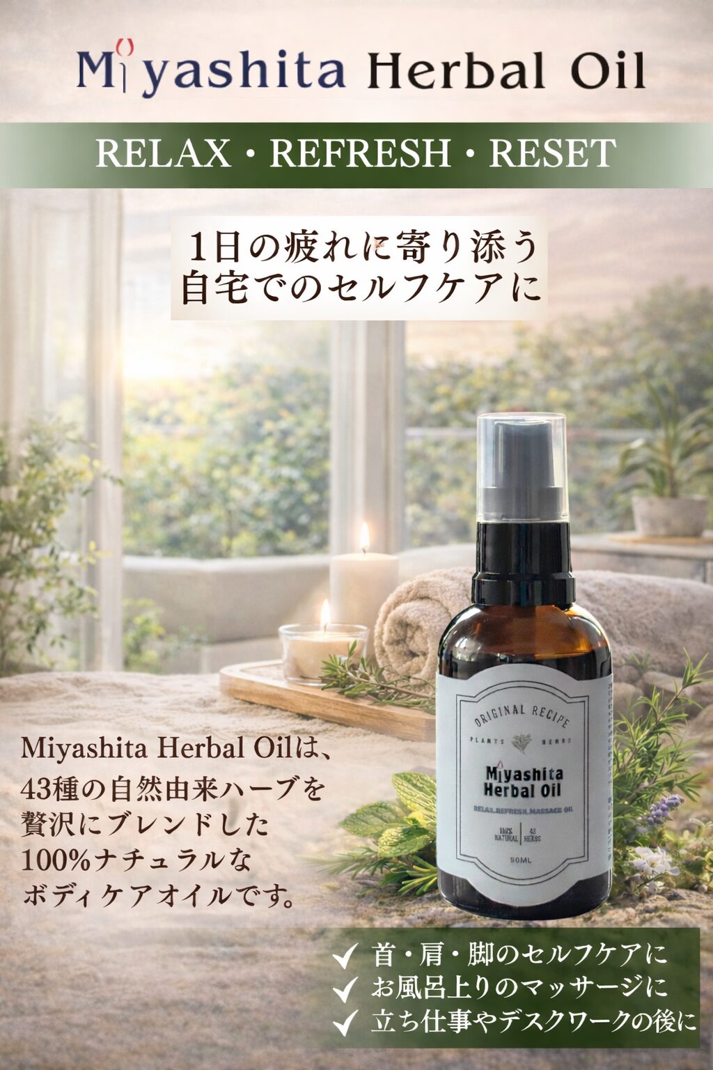 Miyashita Herbal Oilは、日々の疲れや緊張を癒し、心地よい一日をサポートするケアオイルです。